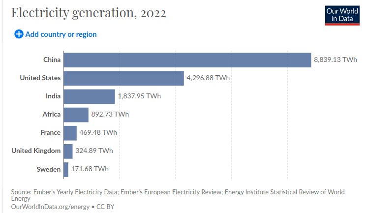 To grasp the full picture, examining 2022 data from Our World in Data is illuminating. China led the pack in electricity generation, boasting an impressive 8.3 pettawatt hours (PWh) in energy generation. Trailing behind was America with 4.2 PWh, India’s 1.8 PWh, and Africa’s 0.9 PWh.