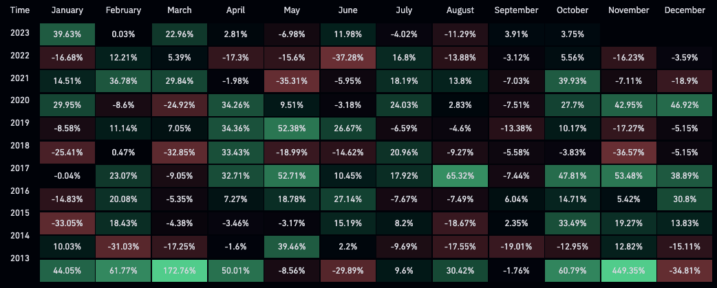 “Uptober,” a term coined by the crypto community, represents a traditionally bullish October for Bitcoin and its crypto counterparts. According to statistical insights from CoinGlass, October has only recorded negative monthly returns for Bitcoin twice since 2013, illuminating a trend of prosperity and growth in this particular month.