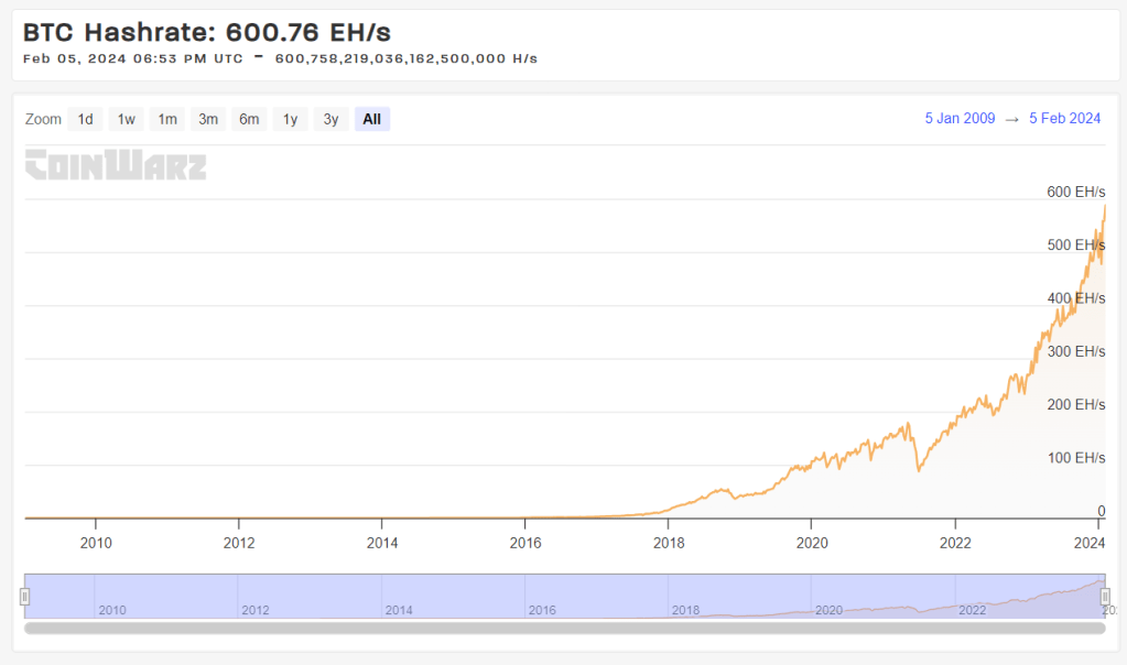 The Bitcoin network’s hash rate, a measure of the total computational power used to secure transactions and generate new blocks, is on a significant upward trajectory. As of early February 2024, the network’s hash rate reached 581.75 million terahashes per second (TH/s), marking a substantial increase from the previous year’s figures. This growth reflects a more than doubling of the network’s computational power, indicating robust participation and investment in Bitcoin mining activities.