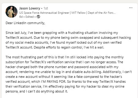 In a letter shared by Space Force Guardian Jason P. Lowery, he details the challenges he faces after being locked out of his X.com account due to hacking. Lowery highlights the frustration of being charged for a verification service he cannot access, as the hacker altered both the phone number and password associated with his account.