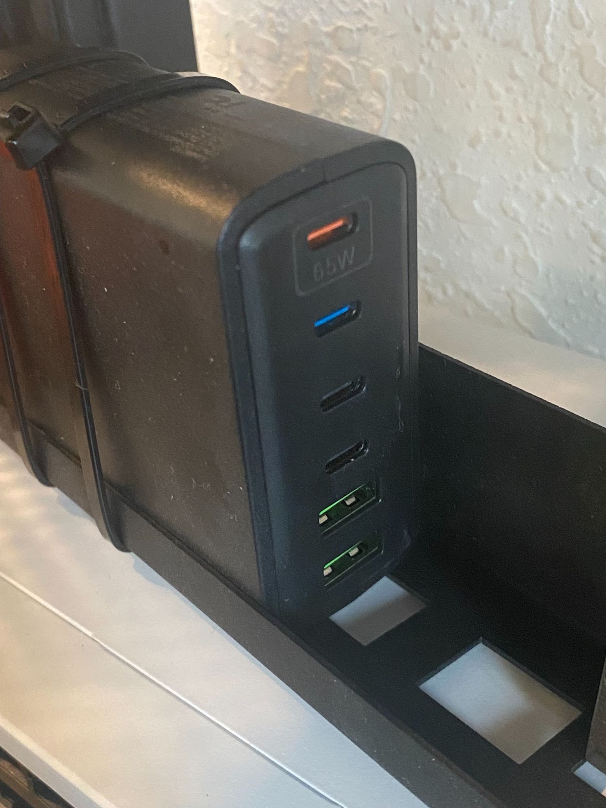 5C. Alternative PSU Mounting Method: To ensure PSU is stable on rack tie 3 zip ties vertically and 3 zip ties horizontally around the PSU. Make sure zip ties are not covering the socket for PSU. PSU should have its USB type C ports visible to plug in other cables/devices.
