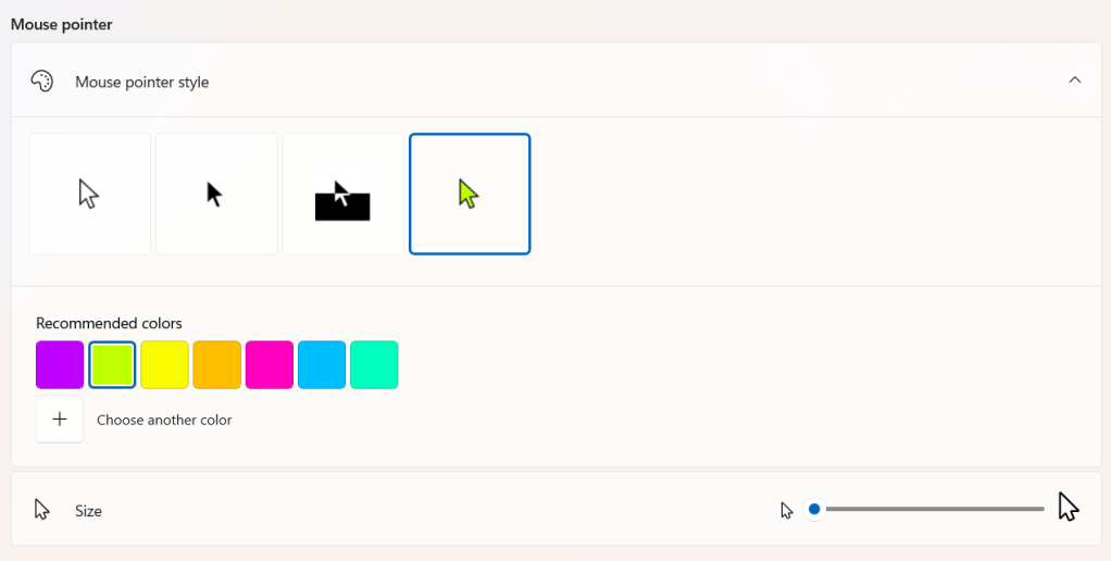 3. Choose your desired size and mouse color. They have default colors but you can also choose a custom color for your cursor (red, blue, etc).