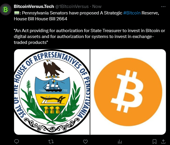Pennsylvania’s House of Representatives has introduced the Pennsylvania Bitcoin Strategic Reserve Act, aiming to authorize the state treasury to allocate up to 10% of its $7 billion reserves into Bitcoin.