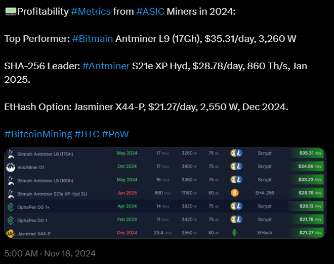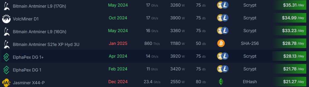 According to Asicminervalue.com, the Bitmain Antminer L9 (17.6Gh) has emerged as a leading performer. Released in May 2024, it offers a hashrate of 17.6 Gh/s and consumes 3,260 W of power, generating an estimated daily profit of $55.42.