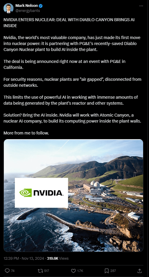 NVIDIA, the world’s most valuable company, has entered the nuclear energy sector by partnering with Pacific Gas and Electric Company (PG&E) to implement artificial intelligence (AI) solutions at California’s Diablo Canyon Nuclear Power Plant.
