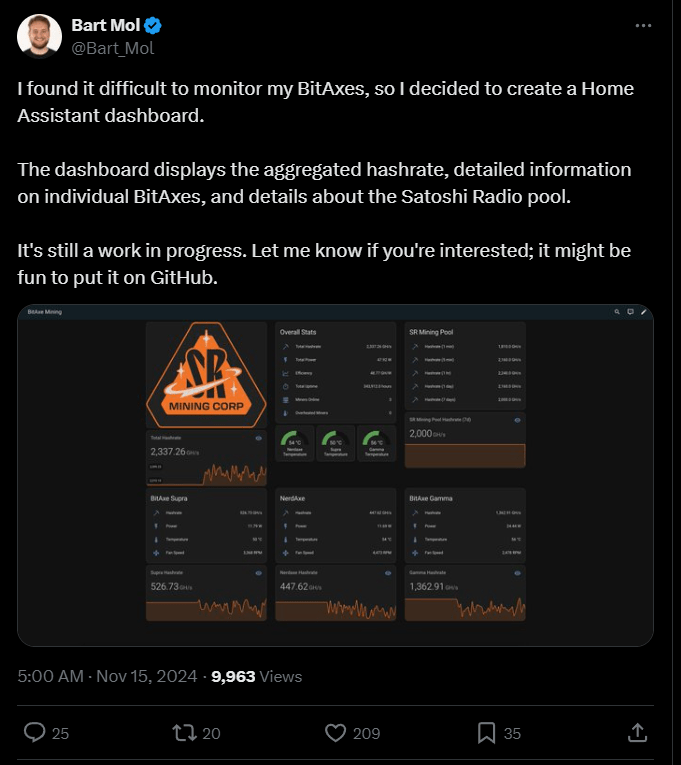 Unveiled on X.com, Mol shared the development, stating that his motivation stemmed from the challenge of tracking multiple BitAxes efficiently.