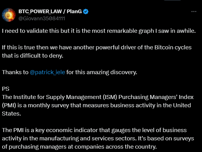 Recent discussions highlight a possible correlation between the ISM PMI and Bitcoin price cycles.