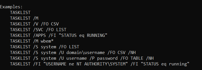 The first screenshot showcases various examples of how the tasklist command can be utilized with different parameters.