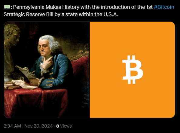 The bill’s introduction follows the Pennsylvania House’s recent passage of the Bitcoin Rights bill, which safeguards residents’ rights to self-custody digital assets and use Bitcoin as a payment method. This earlier legislation received strong bipartisan support, passing with a majority of 176 votes to 26.
