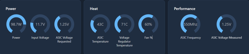 In terms of performance, the SupraHex Bitaxe operates at an ASIC frequency of 550 MHz, with an ASIC voltage measured at 1.25 volts.