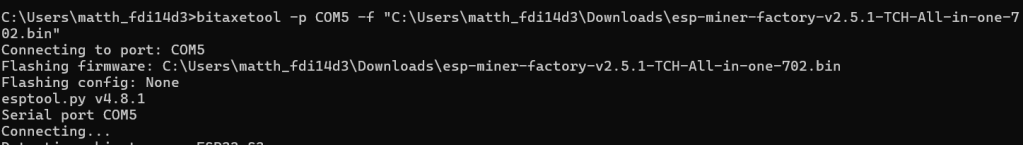 bitaxetool -p COM5 -f "C:\Users\YourUsername\Downloads\esp-miner-factory-v2.5.1-TCH-All-in-one-702.bin"