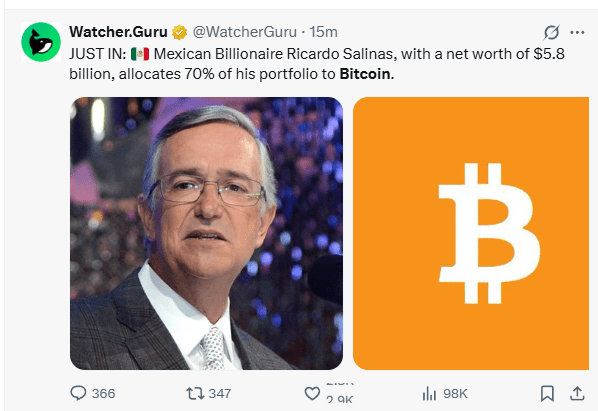 Mexican billionaire Ricardo Salinas – who has an estimated net worth of $5.8 billion – has significantly increased his investment in Bitcoin, now allocating approximately 70% of his liquid portfolio to the cryptocurrency.
