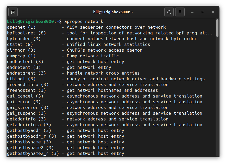 Similarly, apropos network shows commands associated with network management. Using apropos user will display commands related to user accounts.