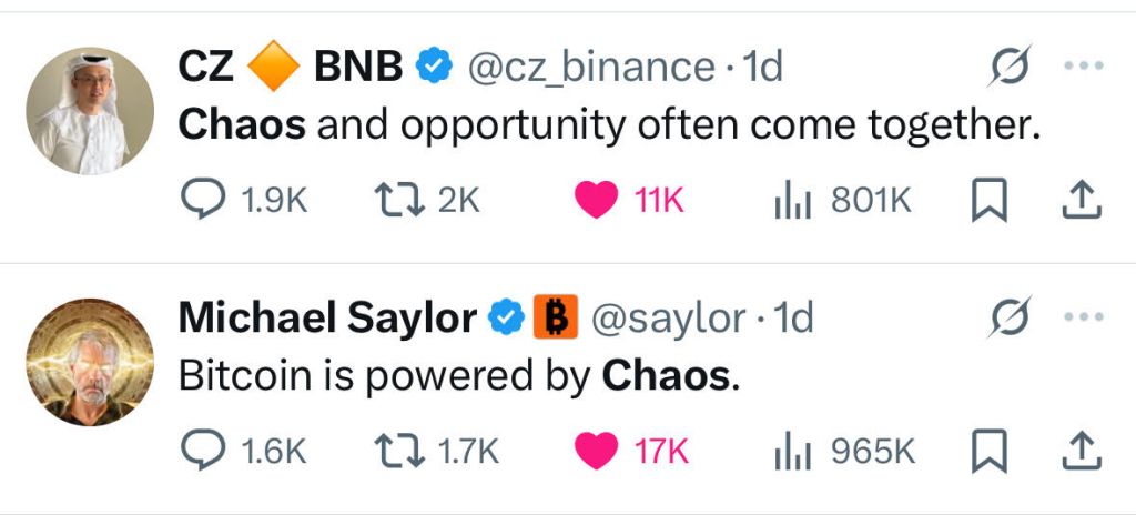 CZ posted, “Chaos and opportunity often come together,” while Saylor wrote, “Bitcoin is powered by Chaos.”