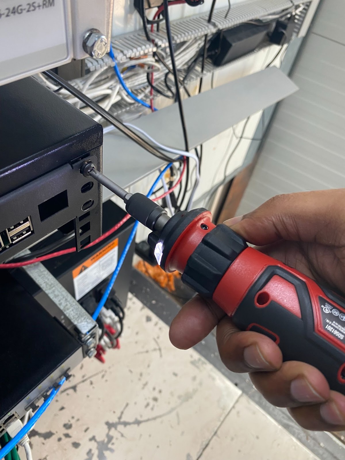 - Close the server rack and drill the screws back in.