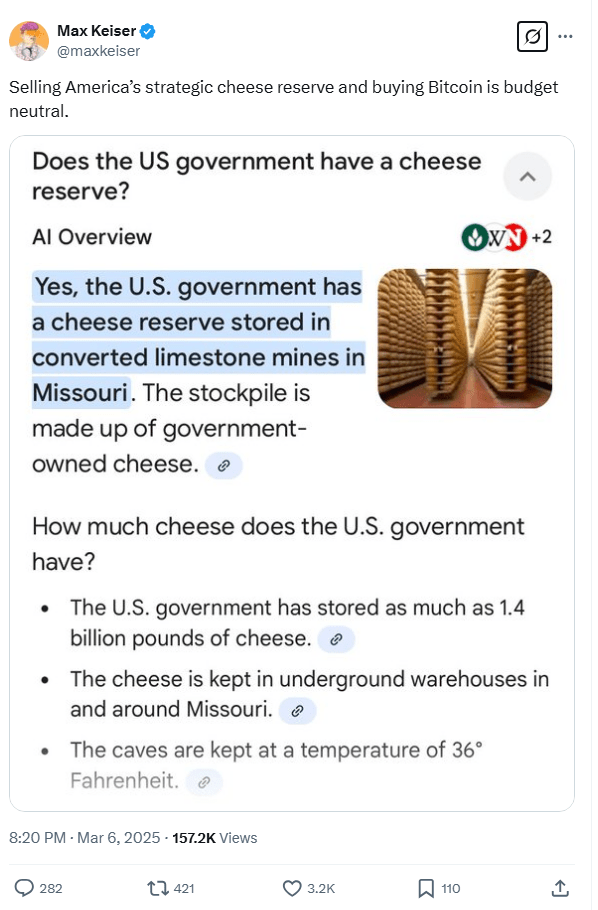 In a recent social media post, prominent Bitcoin advocate Max Keiser humorously proposed that the United States could maintain fiscal neutrality by selling its substantial cheese reserves to invest in Bitcoin.