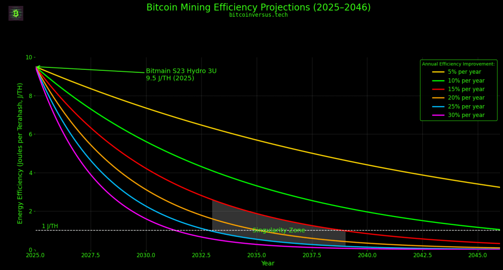Using this sharper trend, and assuming continued annual returns in the 15% – 25% range, the 1 J/TH milestone is expected by 2033 and 2039 at the latest.