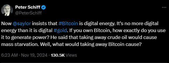 Economist Peter Schiff has publicly criticized Michael Saylor’s characterization of Bitcoin as “digital energy.”