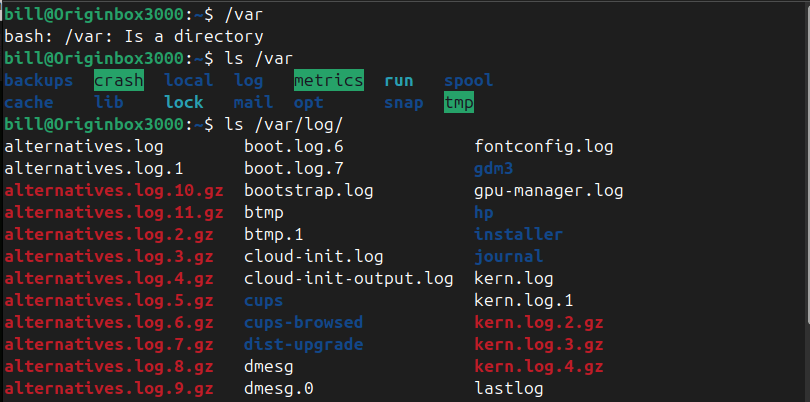 In the screenshot, the user types /var, and the terminal responds by informing them that /var is a directory. The user then uses ls /var to list the contents of the /var directory, which includes important subdirectories like log, mail, spool, and tmp. Afterward, the user runs ls /var/log to view the detailed contents of the log folder, displaying system log files such as kern.log, dmesg, and several compressed .gz archives, which are critical for monitoring system health and troubleshooting.