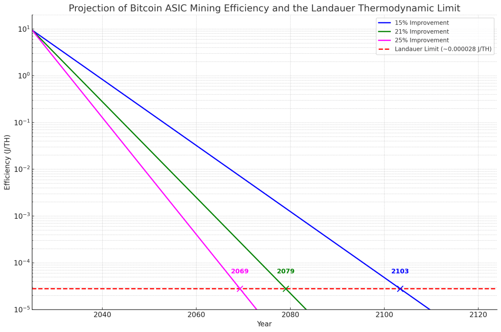 With an annual improvement rate of 25 percent, the theoretical minimum energy use per terahash would be reached in the year 2068. At an annual rate of 21 percent, the limit would be met in 2078, and at 15 percent per year, not until 2102.