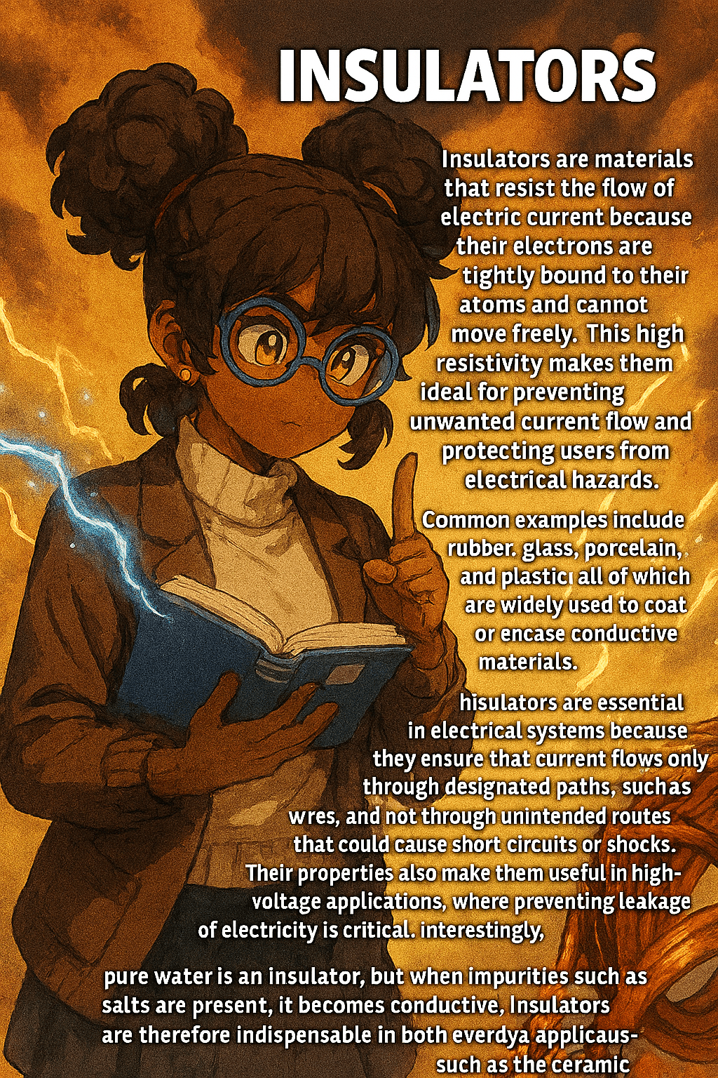 Interestingly, pure water is an insulator, but when impurities such as salts are present, it becomes conductive. Insulators are therefore indispensable in both everyday applications, such as the plastic casing of appliances, and advanced technologies, such as the ceramic insulators used in power transmission lines.