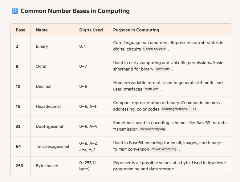 Hexadecimal (Base 16): Uses 16 digits (0-9, A-F) and is a shorthand for binary, making it easier to read and write binary data. It’s commonly used for coding, debugging, and representing colors, memory addresses, and more.