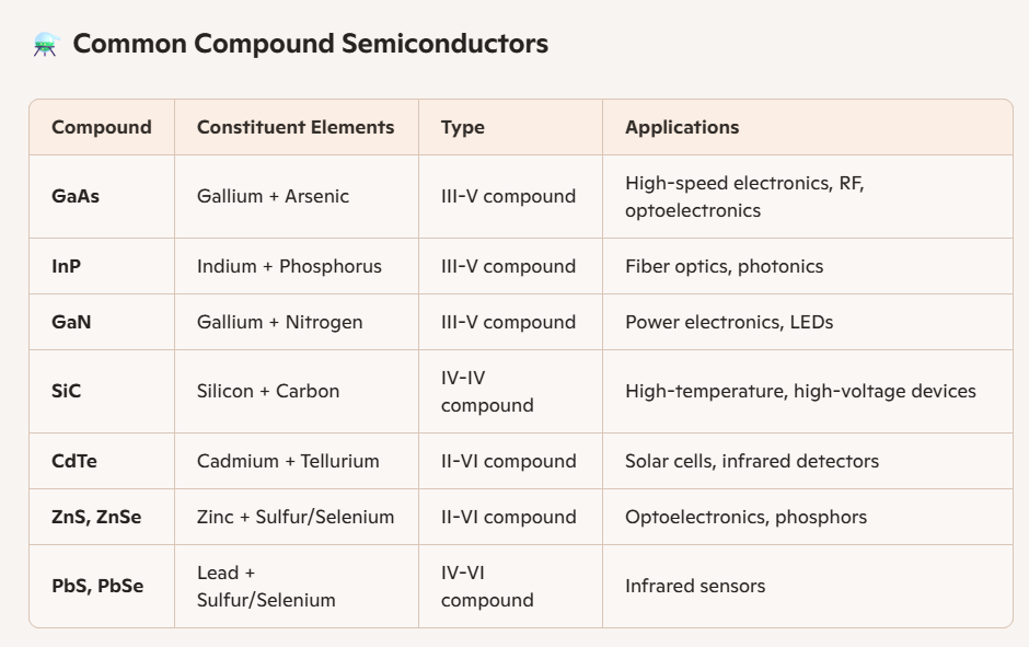 Compound semiconductors are formed by combining elements from different groups, such as III–V compounds like gallium arsenide (GaAs) and indium phosphide (InP), which are prized for their high electron mobility and use in optoelectronics.